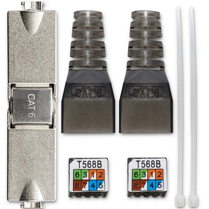 The toolless STP Cat6 Jack Pin is a convenient and easy-to-use solution for situations where there is a need for a quick installation or network upgrade. This innovative connector allows for instant installation of Category 6 cable, eliminating the need for specialised tools such as a crimping tool. Without the hassle of tools, our plug enables express adaptation to T568A or T568B standards, delivering robust connections for the highest quality networks. The specially designed snap mechanism allows for easy insertion and crimping of the cables. It is the perfect solution for professionals who value performance, precision and durability in their installations.