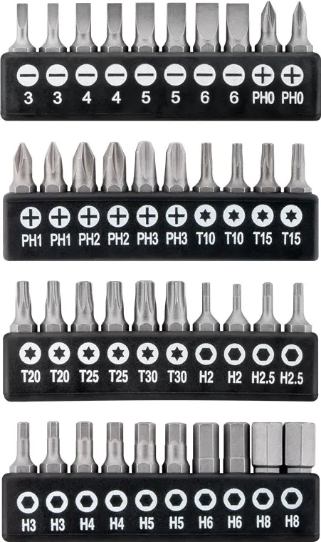 Биты (40x, по 2 шт. каждого размера): 8x Шлицевые (3 мм, 4 мм, 5 мм, 6 мм), 8x Крестовые (PH0, PH1, PH2, PH3), 10x Torx (T10, T15, T20, T25, T30), 14x Шестигранные (H2, H2.5, H3, H4, H5, H6, H8)