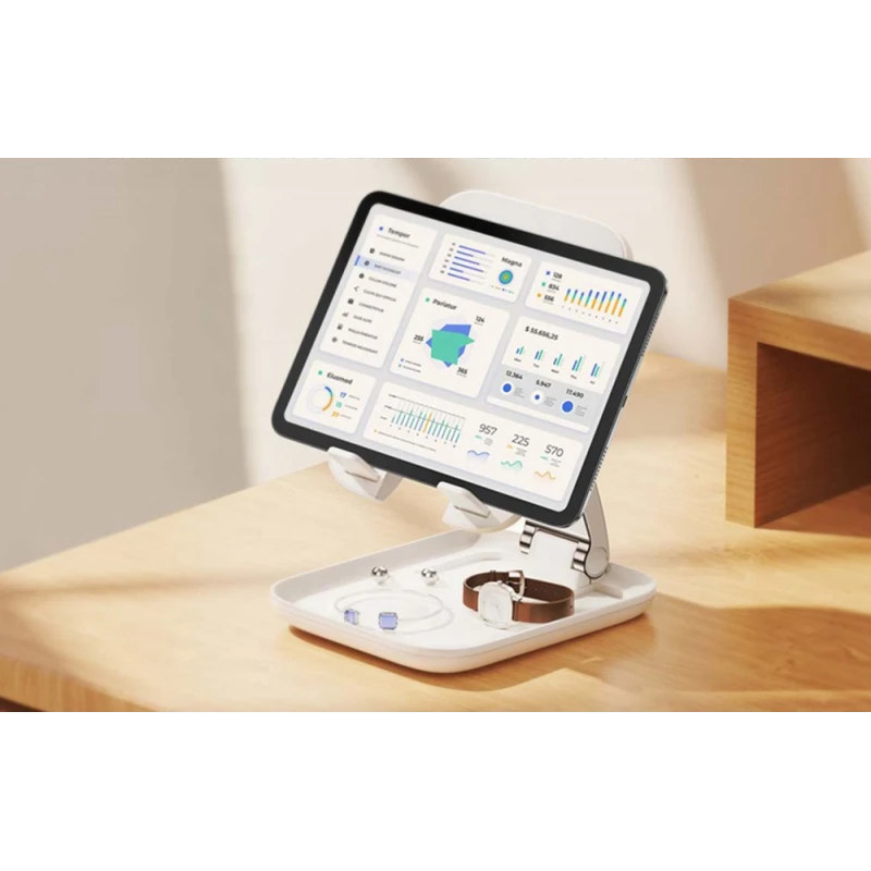 Простота использованияУдобство использования — один из основных аспектов складной подставки для планшета. Его нижняя часть может служить основой для небольших аксессуаров, таких как наушники, часы или серьги, что делает его чрезвычайно простым и удобным в использовании. Кроме того, штатив имеет регулировку высоты от 140 до 200 мм, поэтому вы можете легко настроить его в соответствии с вашими индивидуальными потребностями. Но это еще не все – основание также оснащено двойным шарниром, позволяющим регулировать угол наклона верхней части до 110° и нижней части до 80°. Это делает его еще более функциональным и удобным.
