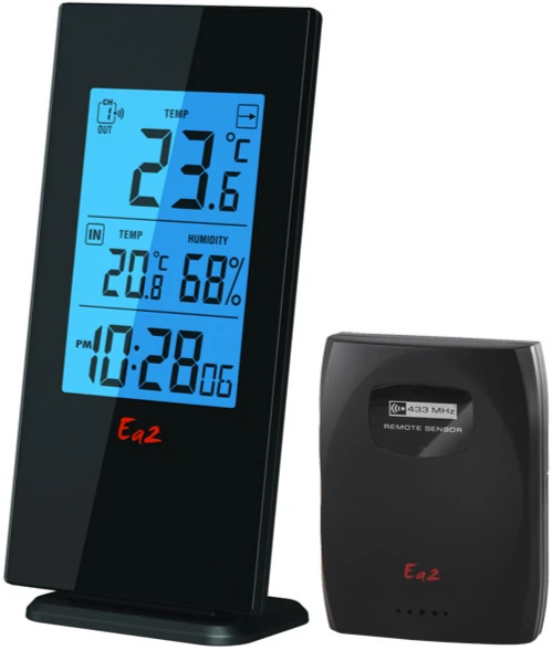 Термометр с часами из коллекции «Black». Измерение температуры и влажности внутри помещения внутренним датчиком. Посредством внешнего дистанционного датчика измеряется внешняя температура. Стрелочными индикаторами, возле пиктограмм, отображается динамика изменения параметра (стрелка вверх — рост, нейтральная стрелка — стабильно, стрелка вниз — падает).