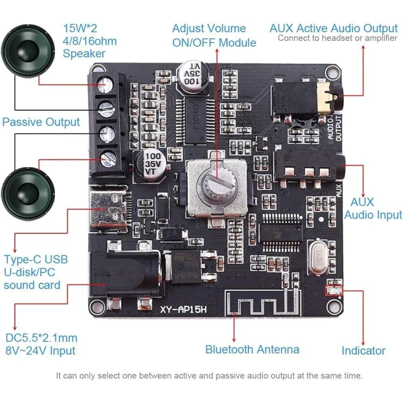 Представляем XY-AP15H, мощный стереофонический аудиомодуль Bluetooth, идеально подходящий для DIY-проектов. Он оснащен встроенным усилителем, что позволяет подключать его напрямую к динамикам, делая его отличным выбором для создания беспроводных Bluetooth-колонок и транспондеров. Универсальные входы, включая Bluetooth, AUX, USB-накопитель и даже звуковую карту USB компьютера, обеспечивают полную гибкость.