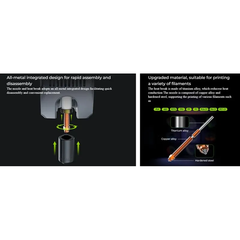 - Наконечник из закаленной стали обеспечивает исключительную долговечность, подходит для печати абразивными филаментами.
