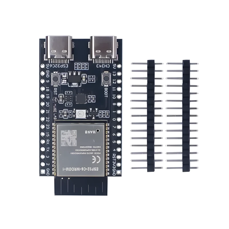 Эта отладочная плата на базе модуля Espressif ESP32-C6-WROOM-1-N4 разработана для широкого спектра приложений Интернета вещей (IoT). Она оснащена мощным 32-битным одноядерным процессором RISC-V и расширенной поддержкой беспроводных протоколов.