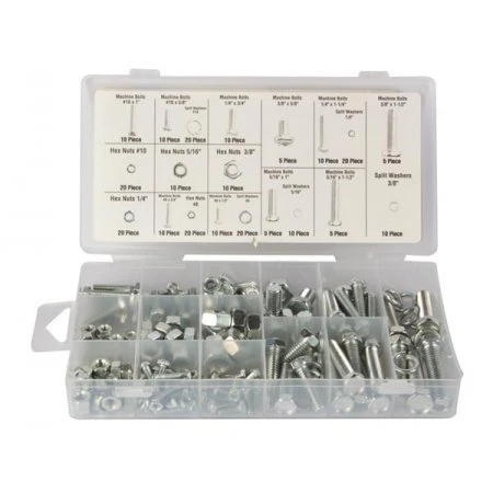 Комплект различных болтов, гаек и шайб наиболее используемых размеров. Поставляется в ПВХ-коробке.