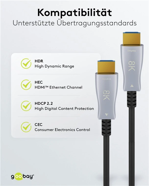 Поддерживает передачу сигнала UHD высокого разрешения до 8K при 60 Гц (4320p), макс. скорость передачи до 48 Гбит/с и все обычные функции, такие как ARC (возвратный аудиоканал), HDCP или контент 4K с 3D.