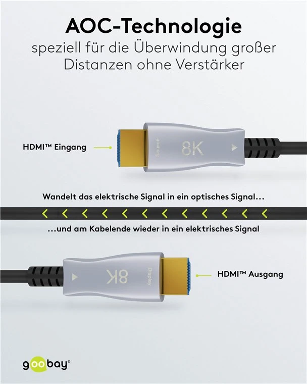 Кабель для передачи данных на большие расстояния. Оптический кабель Ultra High Speed HDMI™ идеально подходит для покрытия расстояний до 100 м, обеспечивая значительно большую гибкость и более высокие скорости передачи, чем стандартные медные кабели.
