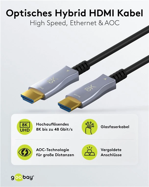 Кабель 8K AOC (активный оптический кабель) с разъемами HDMI и гибридным оптоволоконным медным кабелем для передачи без помех. Стекловолоконный материал делает кабель очень гибким и имеет очень малый радиус изгиба.