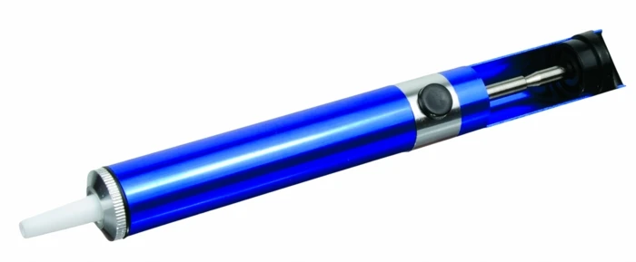 Алюминиевый отсос для припоя. Предназначен для удаления излишков припоя при демонтаже. Наконечник из тефлона не прилипает к припою и при необходимости заменяется.