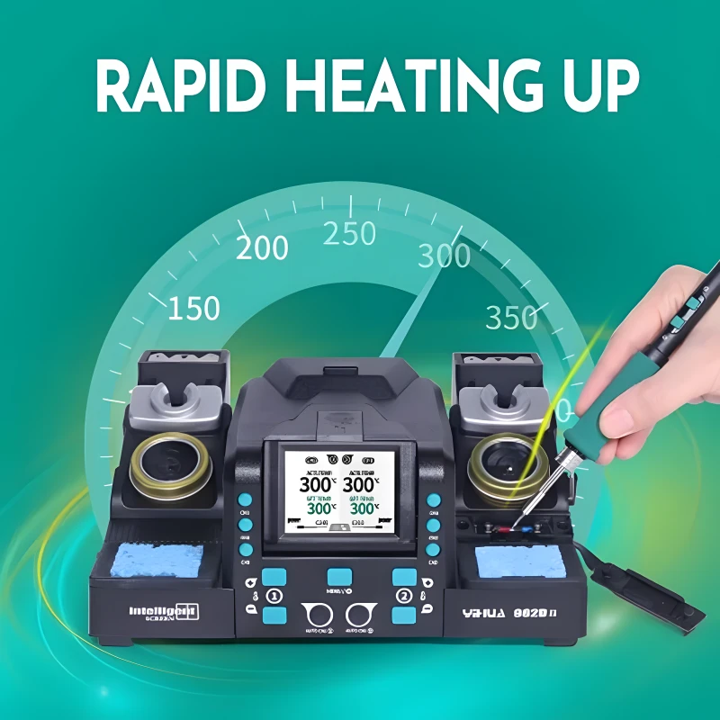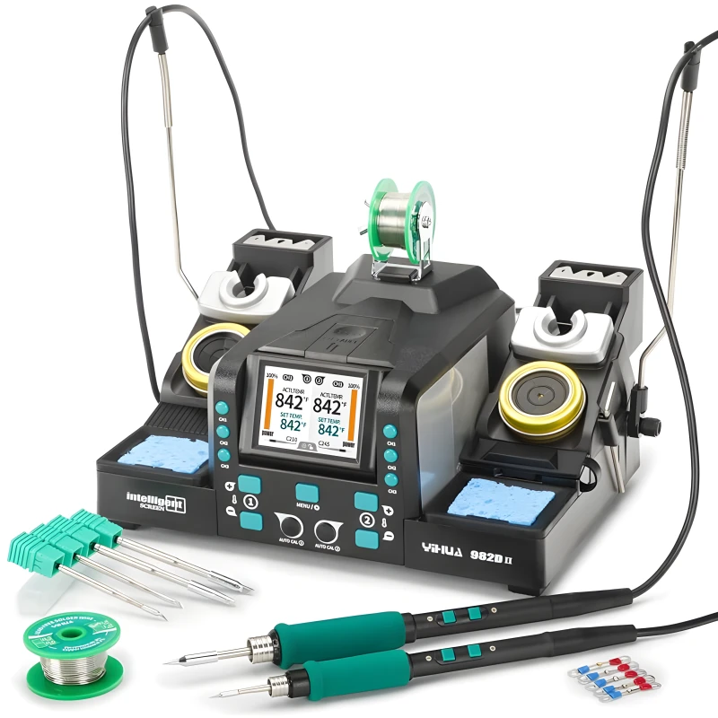 Паяльная станция YIHUA 982D-II (C210 C245) — это профессиональная прецизионная паяльная станция 2-в-1, разработанная для высокоточной пайки и демонтажа. Она оснащена двумя одновременно работающими рукоятками (C210 и C245), что обеспечивает универсальность для широкого спектра применений, от микрокомпонентов до более крупных соединений.