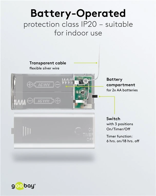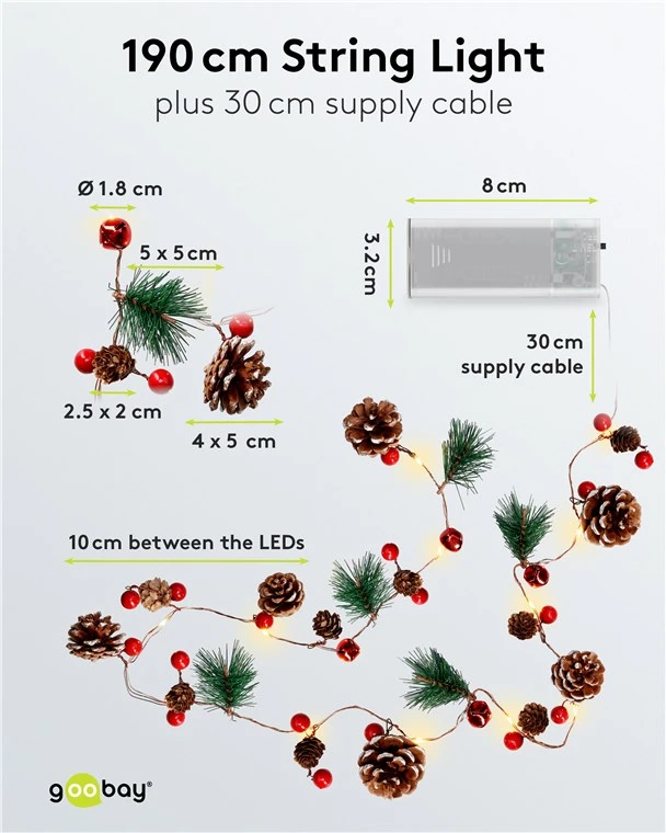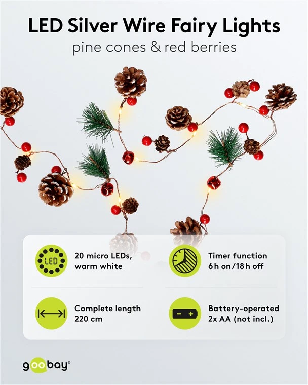 Гирлянда Goobay "Серебряная проволока, сосновые шишки и красные ягоды" обеспечивает праздничное, теплое белое декоративное освещение для внутренних помещений. Эти гирлянды, оснащенные 20 светодиодами на длине 2,2 метра и работающие от батареек, идеально подходят для создания атмосферы осенью, зимой и в праздничный сезон.