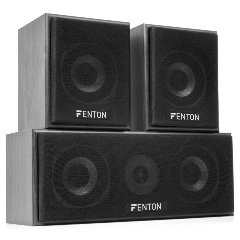 Черный комплект поставляется с акустическими кабелями и легко подключается к усилителю объемного звука.