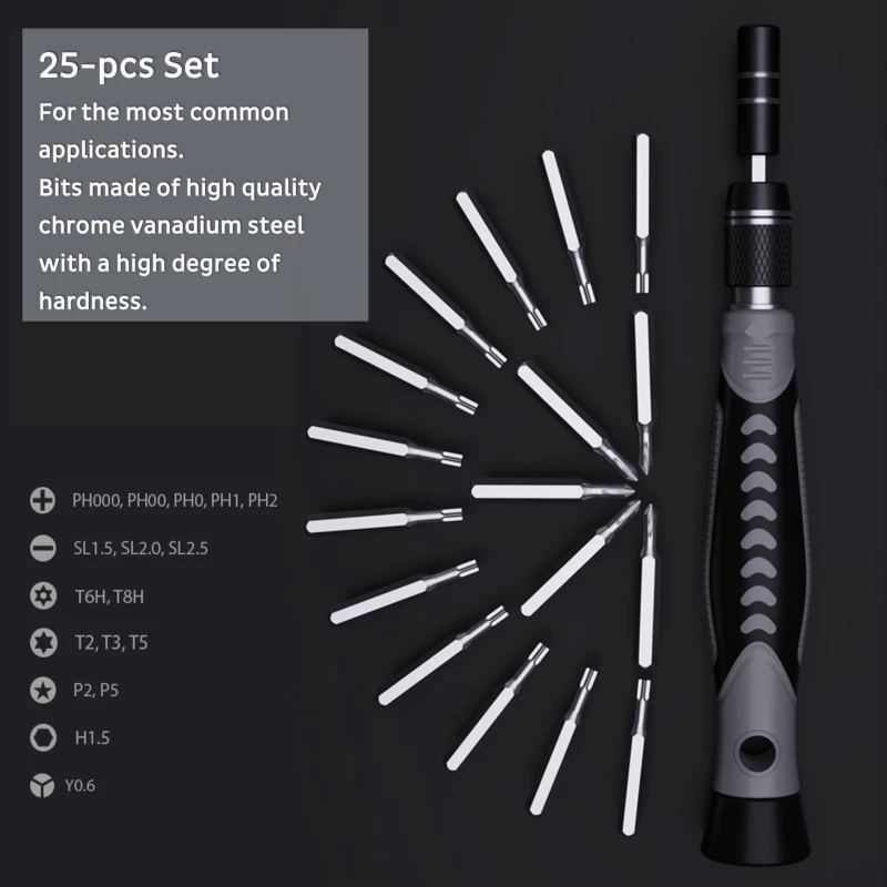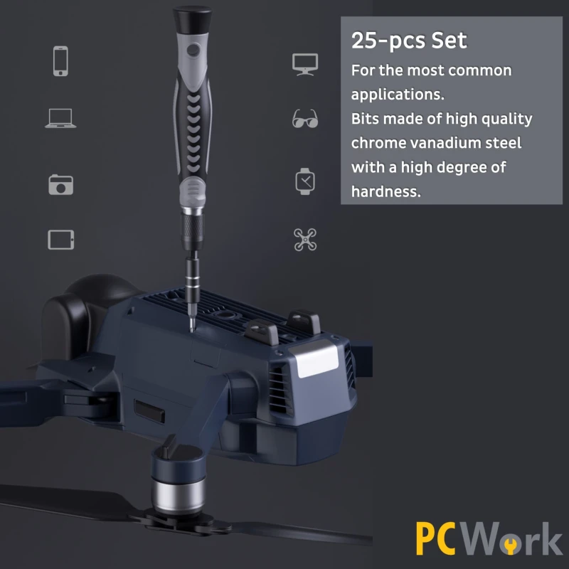 Набор отверток для ремонта телефона, планшета и ноутбука Набор прецизионных отверток PCW08H — это высококачественный инструментальный комплект, состоящий из 25 предметов. В него входят 17 бит, изготовленных из высококачественной хромованадиевой стали, что обеспечивает их долговечность и устойчивость к износу даже при регулярном использовании.
