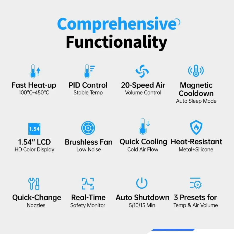 - Точное ПИД-регулирование температуры обеспечивает быстрый нагрев с минимальным тепловым ударом, продлевая срок службы нагревательного элемента.