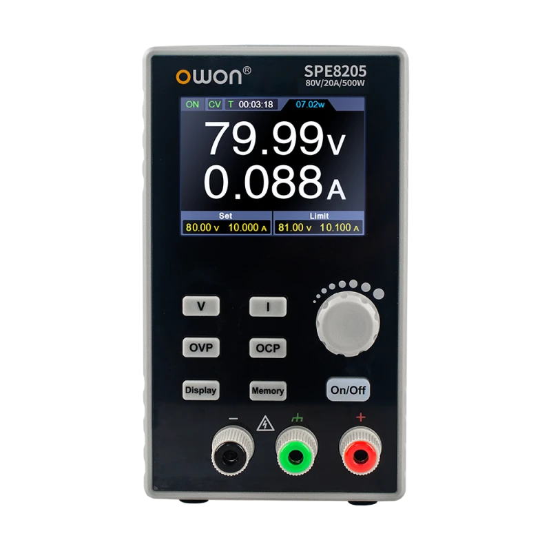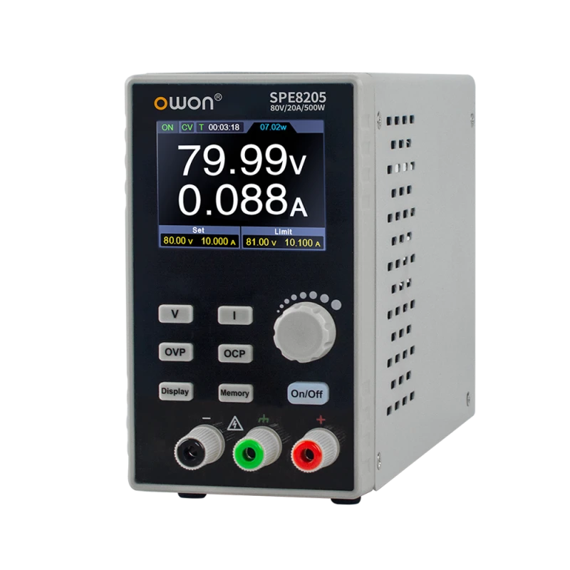 OWON SPE8205 — это программируемый одноканальный лабораторный источник питания с выходным напряжением до 80 В и выходным током до 20 А, максимальной мощностью 500 Вт. Он имеет компактный дизайн и цветной IPS-дисплей диагональю 2,8 дюйма для четкого отображения заданных и фактических значений.