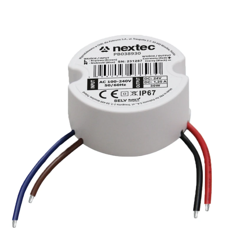 Nextec PB038930 — это компактный герметичный блок питания мощностью 30 Вт, предназначенный для обеспечения стабильного выходного напряжения 24 В для систем светодиодного освещения. Его специальный круглый форм-фактор и малый диаметр 50 мм позволяют легко интегрировать его в стандартные распределительные коробки или ограниченные пространства внутри светильников.