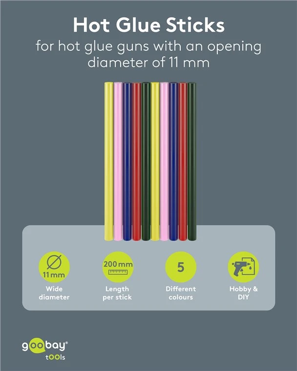 Этот набор из 10 цветных клеевых стержней Goobay Tools предназначен для использования со стандартными термопистолетами, обеспечивая быстросохнущий, высокотекучий термопластичный клей для различных творческих проектов и ремонта.