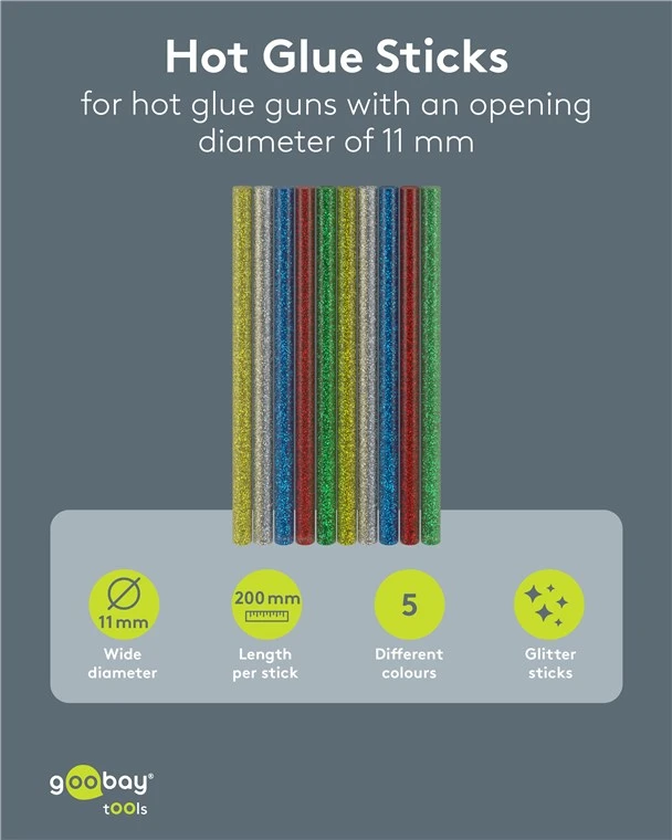 Клеевые стержни Goobay Glitter предназначены для творческих и декоративных работ, обеспечивая прочное соединение с блестящим эффектом. Этот набор включает 10 стержней пяти ярких, мерцающих цветов, совместимых со всеми стандартными клеевыми пистолетами 11 мм.