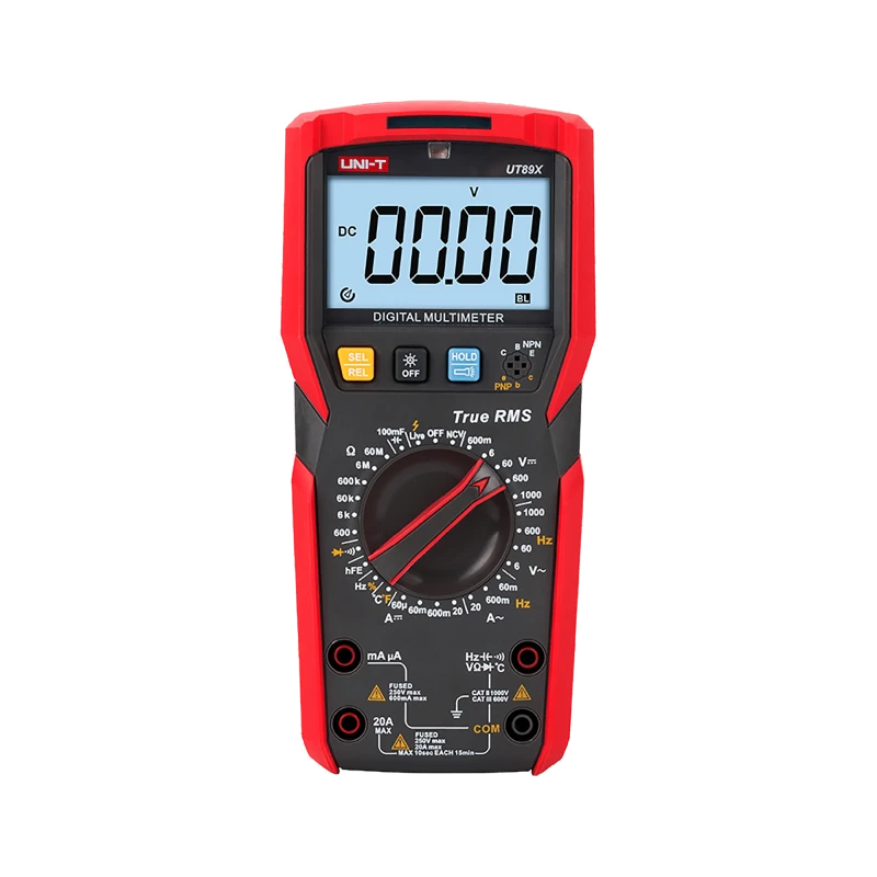 UT89X — это надежный портативный 3 5/6-разрядный цифровой мультиметр с функцией измерения истинного среднеквадратического значения синусоидального сигнала. Он может измерять макс. напряжение постоянного/переменного тока 1000 В, макс. постоянный и переменный ток 20 А, сопротивление, емкость, частоту, диод, hFE, целостность и NCV, быстро и точно различая нейтральные и находящиеся под напряжением провода. UT89X может измерять температуру и обнаруживать нейтральные и находящиеся под напряжением провода с помощью измерительного провода. Оснащенный звуковой и визуальной сигнализацией, фонариком и функциями автоматической подсветки, его можно использовать в темной среде.