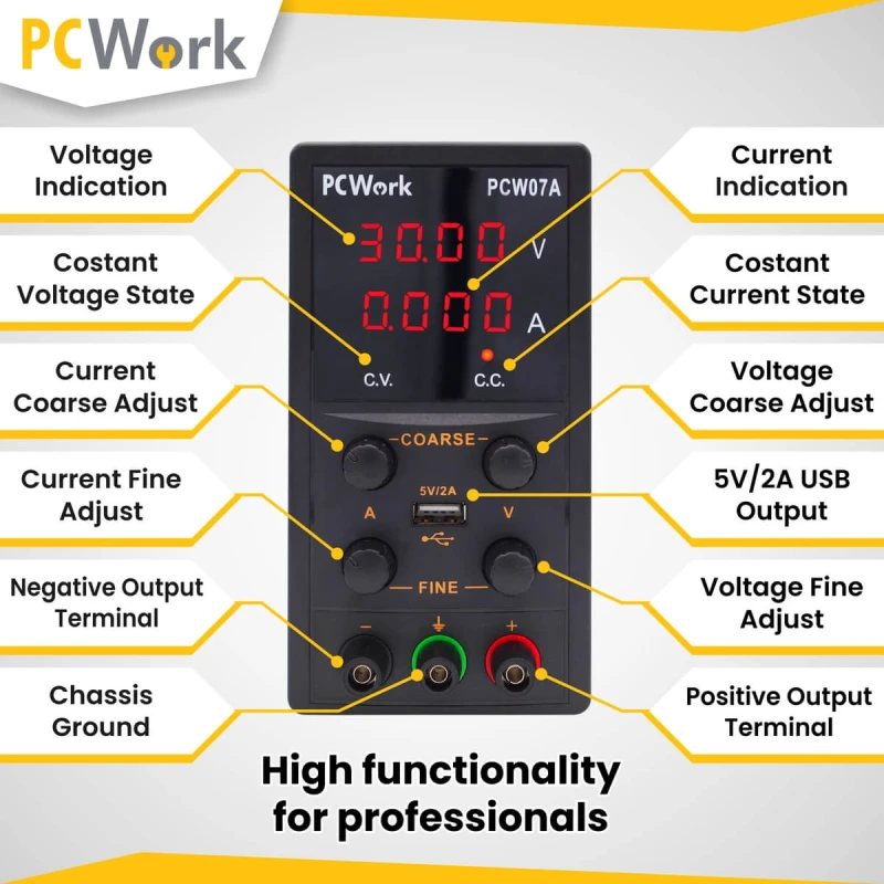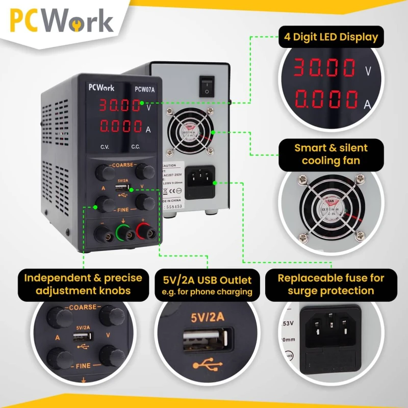 Лабораторный блок питания PCW07A — это идеальное решение как для амбициозных любителей, так и для профессиональных электронных лабораторий. Устройство обеспечивает высокую точность и стабильную работу, позволяя регулировать выходное напряжение в диапазоне 0-30 В и ток в пределах 0-5 А.