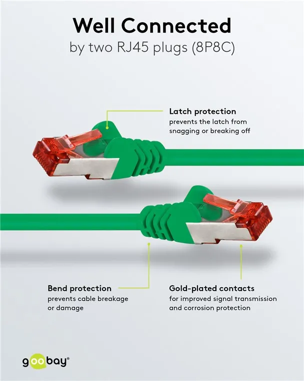 Our CAT cables transmit signals in top quality at high speed, always guaranteeing a stable connection. High-quality inner conductors, robust cable sheathing and precisely fitting plugs distinguish our portfolio of connection cables and plugs. Goobay always provides the perfect products for your network needs - whether you aim to set up a home or company network. Simply. All. You need!
