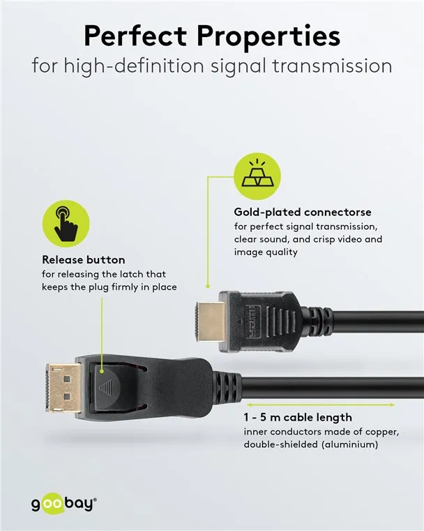 Goobay provides the perfect electronic accessories to connect your PC or laptop to an external screen. Our products transmit top-quality signals for a razor-sharp picture. The robust construction and high-quality materials of our cables, adapters, converters and plugs create an impressive picture. Simply. All. You need!