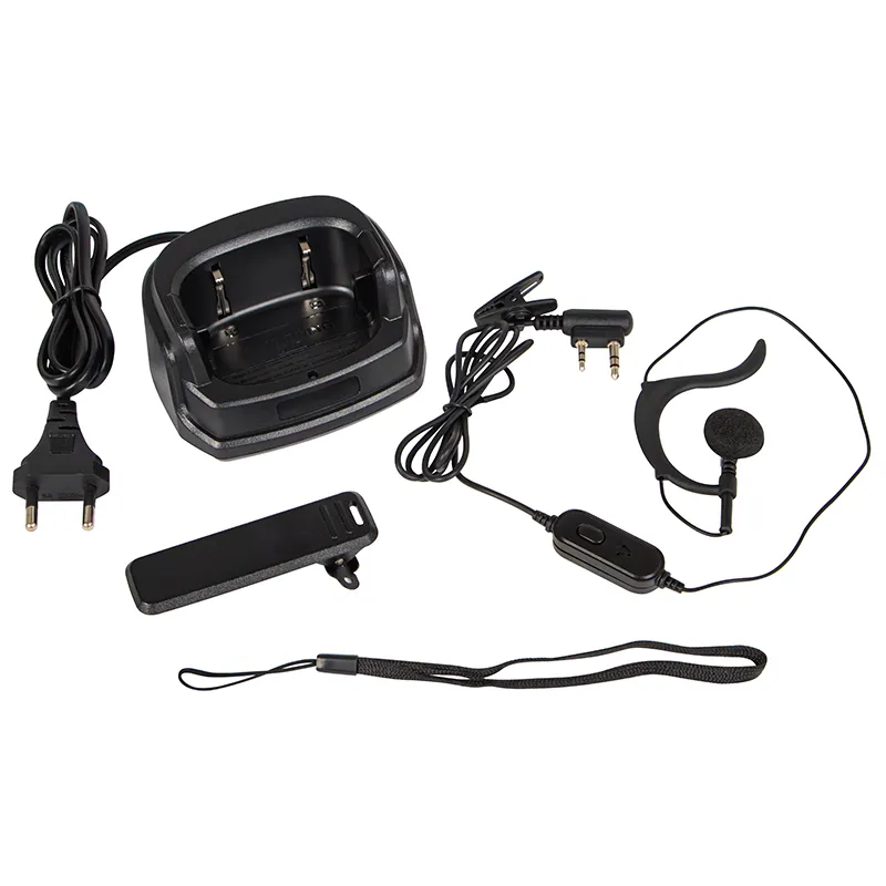 В комплект входит: Зарядная станция, адаптер питания, антенна, гарнитура PTT, шнурок, зажим для ремня