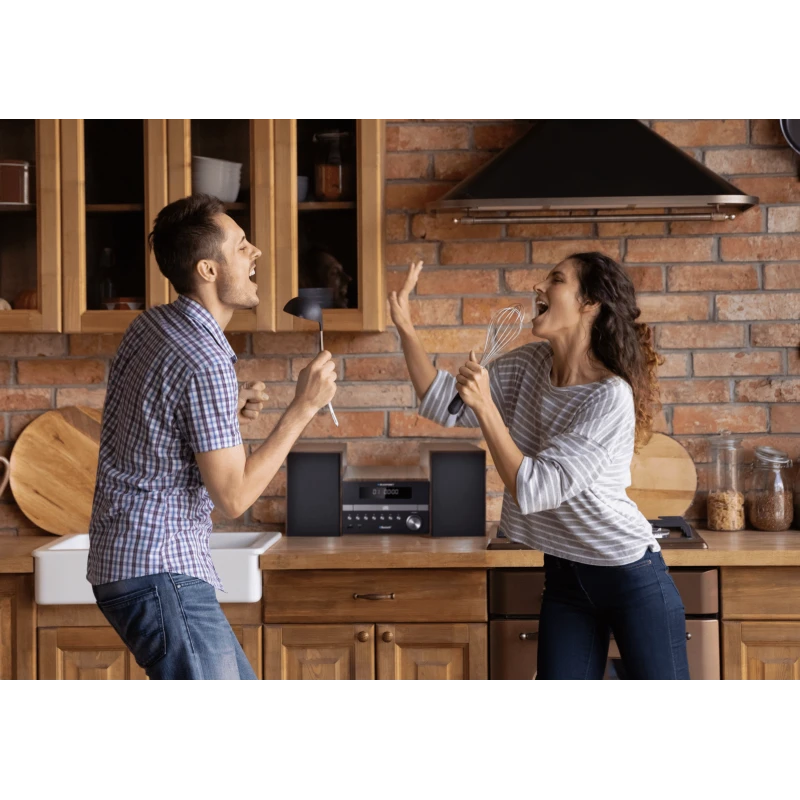 На светодиодном дисплее есть часы с функцией будильника, поэтому вы можете запрограммировать микростерео на автоматическое включение в заданное время. Рядом с экраном находится большая кнопка регулировки громкости, а функциональные кнопки вынесены на дно корпуса. Благодаря функции RDS на экране также отображается информация о радиостанциях, такая как название радиостанции, дата и время, название программы, которая сейчас в эфире, название песни и т. д.