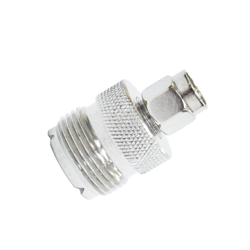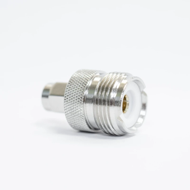 - Имеет конфигурацию UHF гнездо (SO239) — SMA штекер (вилка).