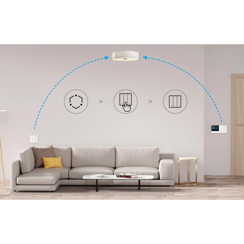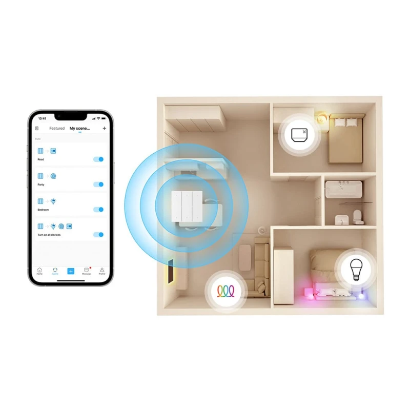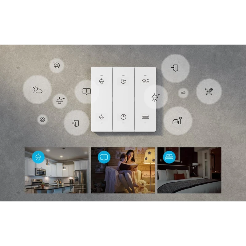 Прост в установке, можно пометить кнопки наклейками. Один клик открывает интеллектуальную сцену, созданную в приложении. Можно управлять несколькими устройствами - до 8 R5 на один шлюз eWeLink.