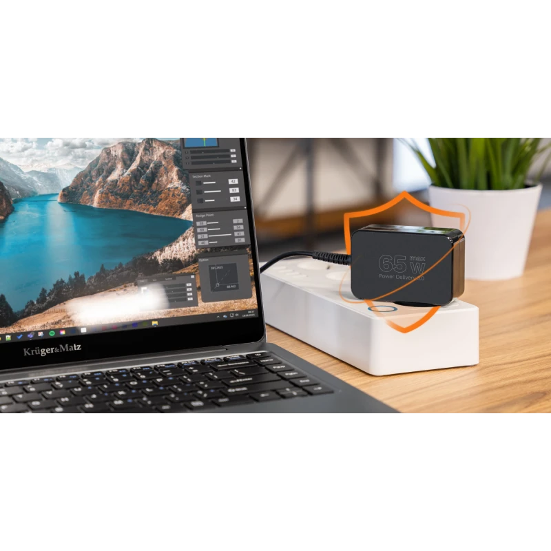 Адаптер мощностью 65 Вт обеспечивает стабильную и быструю зарядку ноутбуков и мобильных устройств. Он поддерживает технологию Power Delivery 3.0, предлагая различные уровни напряжения, благодаря чему автоматически подстраивает параметры под подключенное оборудование. Это практичное и энергоэффективное решение для повседневного использования.