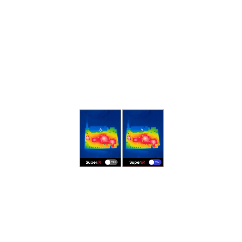 Улучшенная тепловая четкость с помощью SuperIR - Технология улучшения изображения SuperIR от HIKMICRO увеличивает разрешение получаемых тепловых изображений до 640 x 480 (307 200 пикселей), что значительно улучшает качество тепловых изображений. Он также обеспечивает плавную частоту кадров 25 Гц для просмотра в реальном времени и фотографий. * SuperIR в реальном времени доступен только в тепловом режиме.