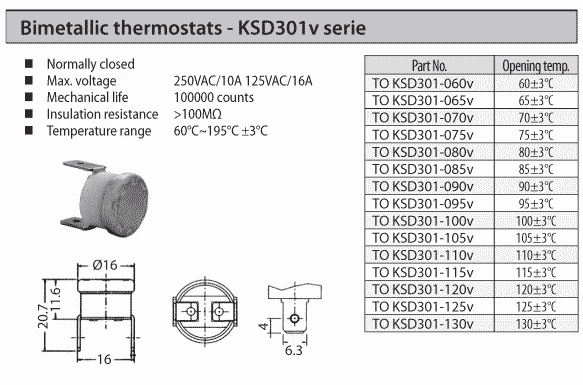 Термостат NC 120° , вертикальные клеммы KSD301A-120h, 250VAC, 10A