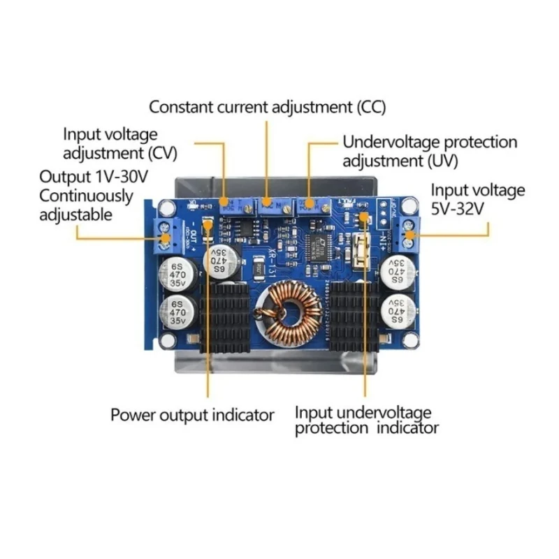 Способность модуля работать с колеблющимся входным напряжением и обеспечивать выходной сигнал в режимах CV и CC делает его идеально подходящим для требовательных приложений. Это отличный выбор для систем зарядки от солнечных батарей, создания стабильных источников питания для ноутбуков в автомобилях и различных проектов в области автомобильной электроники, где входное напряжение может быть нестабильным.