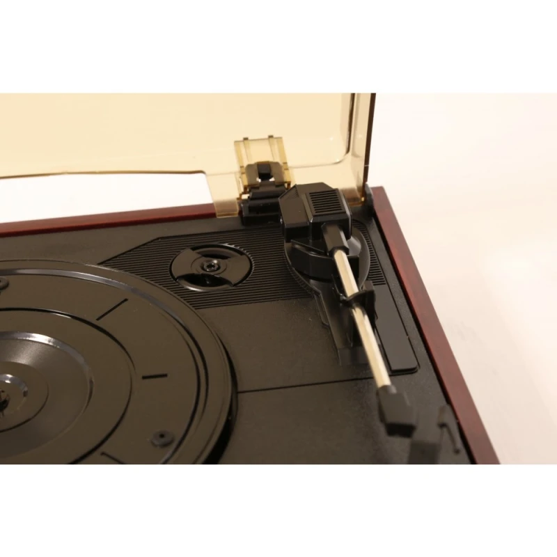 Виниловый проигрыватель с имитацие деревом, со встроенными колонками. Проигрывает со скоростью 33 1/3 и 45 RPM. Проигрывает 7", 10" и 12" пластинки .