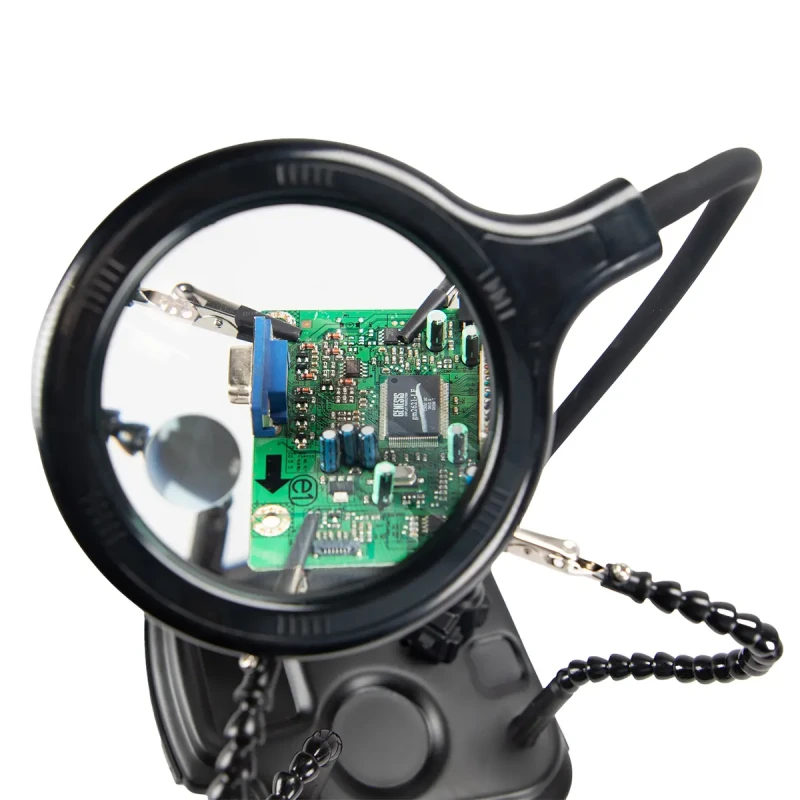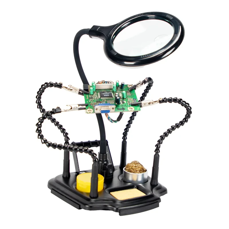 Этот держатель печатной платы идеально подходит для любого применения, где требуется третья или четвертая рука и увеличительная лампа. Вспомогательные руки с 4 регулируемыми гусиными шеями. Светодиодная увеличительная лампа с интерфейсом USB-C. Металлическое основание с нескользящими резиновыми полосками. Поставляется с чистящим шариком, губкой, подставкой для припоя и канифолью.