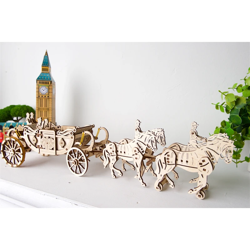 Работая над моделью, дизайнеры Ugears уделили особое внимание деталям: салон кареты имитирует мягкую обивку, кучера одеты в официальную униформу, а четверка грациозных лошадей щеголяет в парадной упряжи. Украшенные королевским гербом двери экипажа фиксируются в открытом и закрытом положении. Резинки выполняют роль ремней декоративной подвески, которые добавляют конструкции реалистичности.