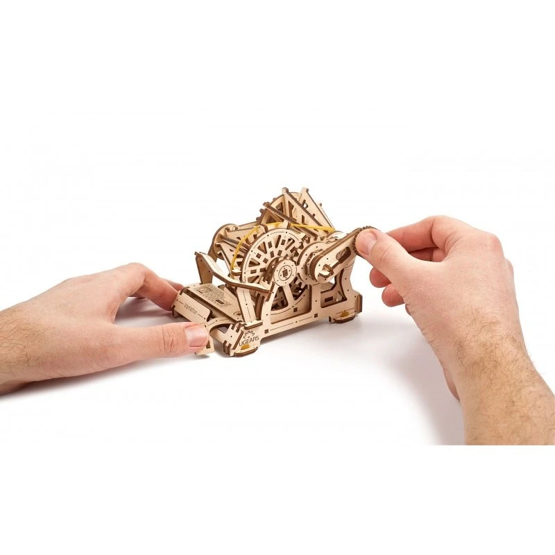 STEAM / STEM образовательный набор с прикрепленным QR-кодом, который позволяет погрузиться в виртуальную реальность и взаимодействовать с моделью-вариатором. Он состоит из 104 элементов, изготовленных из высококачественного шпона (фанеры) от компанииUgearsmodels. Каждый элемент точно изготовлен с помощью метода лазерной резки. Конструкция содержит множество деталей, выдержана в стиле стимпанк, что позволяет наблюдать механизм работы устройства. Модель не имеет электронных компонентов, а все подвижные части двигаются благодаря использованию резинок. В комплект входят листы фанеры, из которых нужно просто выдавить готовые элементы и соединить их вместе, следуя иллюстрированной инструкции, входящей в набор. Для сборки модели не требуется ни клея, ни дополнительных деталей для сборки. Сборка занимает от 3 до 4 часов.