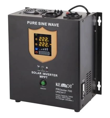 Солнечный инвертор KEMOT PROsolar-700 с номинальной выходной мощностью 700 Вт, благодаря своей обширной функциональности, позволяет работать с фотоэлектрическими модулями и электрической сетью. Прямое подключение к солнечным панелям позволяет устройству использовать солнечную энергию для питания потребителей, подключенных к существующей электрической сети. Устройство также подходит для питания электрооборудования, требующего переменного напряжения 230 В, и в качестве аварийного источника обеспечит бесперебойную работу устройств, требующих непрерывного питания, например, насосов центрального отопления или систем сигнализации и контроля. Преобразователь KEMOT PROsolar-700 имеет прочный корпус, оснащенный кронштейном, который позволяет вешать его на стену, например, в котельной или электрощитовой.