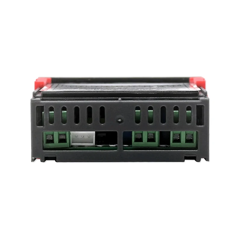 Регулятор температуры и влажности, входящий в комплект датчика, питается от сети 230В. Он имеет 2 читаемых экрана: красный отвечает за показания температуры и синий за влажность и резиновые кнопки для изменения конфигурации. Над каждым дисплеем находится светодиод, который загорается при активации контроля температуры/влажности.