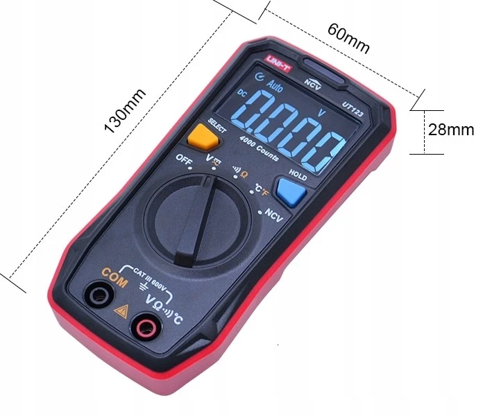 UNI-T UT123T – это карманный цифровой мультиметр, предназначенный для домашнего использования. Прибор удобно лежит в руке, результаты измерений отображаются на EBTN-дисплее размером 44 мм × 26 мм.