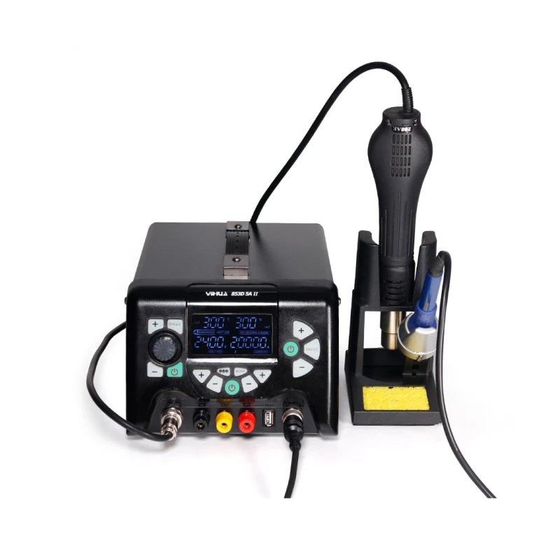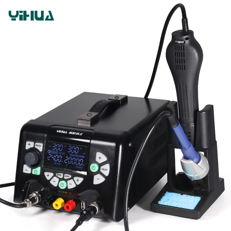 Оснащен паяльником мощностью 120 Вт, термовоздушной пушкой мощностью 700 Вт и лабораторным блоком питания с USB-интерфейсом 5 В 2 А для зарядки во время ремонта.