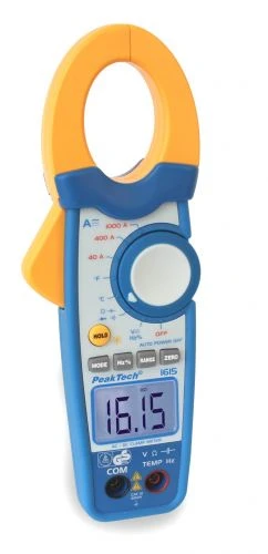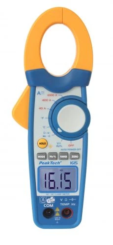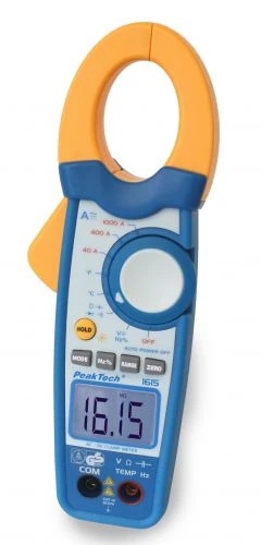 **PeakTech 1615** — это **измерительное устройство** для **переменного и постоянного тока** до **1000 А**, использующее **токовые клещи** для **диаметров проводников до 35 мм**. Токовые клещи идеально подходят для **измерения тока** в **электрических системах и шкафах управления**, поскольку через зажимные губки пропускаются только отдельные провода для **бесконтактного измерения тока**, и нет необходимости отключать электрические соединения. Этот метод также позволяет измерять **очень высокие токи**, которые перегрузили бы любой стандартный мультиметр при прямом подключении.