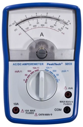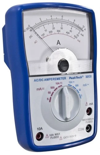 Этот **аналоговый амперметр** характеризуется четким отображением тока в диапазоне **постоянного и переменного тока**. Благодаря используемой аналоговой технологии, **батарейки не требуются**, поэтому это измерительное устройство всегда готово к использованию, даже если оно долго не использовалось.