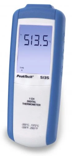 **PeakTech 5135** — это **цифровой термометр** в современном и удобном дизайне с 3 1/2-разрядным дисплеем, макс. 1999, функциональными символами и подсветкой, который обеспечивает быстрое время отклика и высокую точность. 1 ° и очень **универсален**.