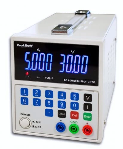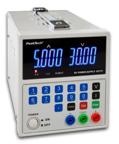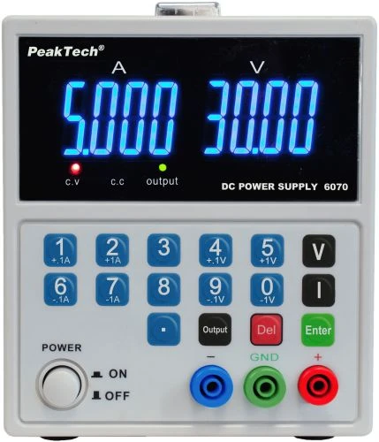 **PeakTech 6070** — это лабораторный источник питания с линейным регулированием. **Шаги 1А или 1В / 1А**. Таким образом, можно избежать длительной настройки желаемого значения с помощью поворотного регулятора.