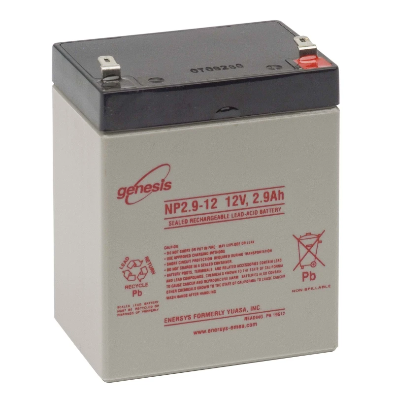 Genesis NP2.9-12 battery is the culmination of more than ten decades of battery manufacturing experience. High energy density, leak proof construction, excellent performance in either float or cyclic applications and long service life combine to make the Genesis NP2.9-12 the most reliable and versatile maintenance free rechargeable sealed lead acid batteries available.