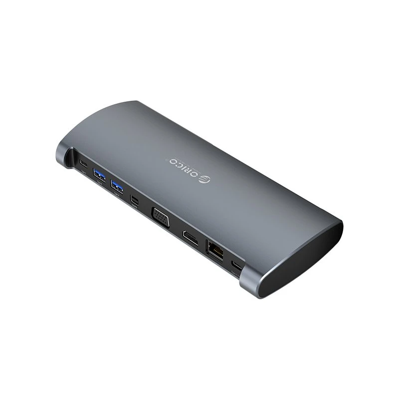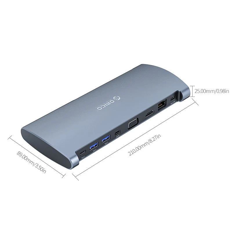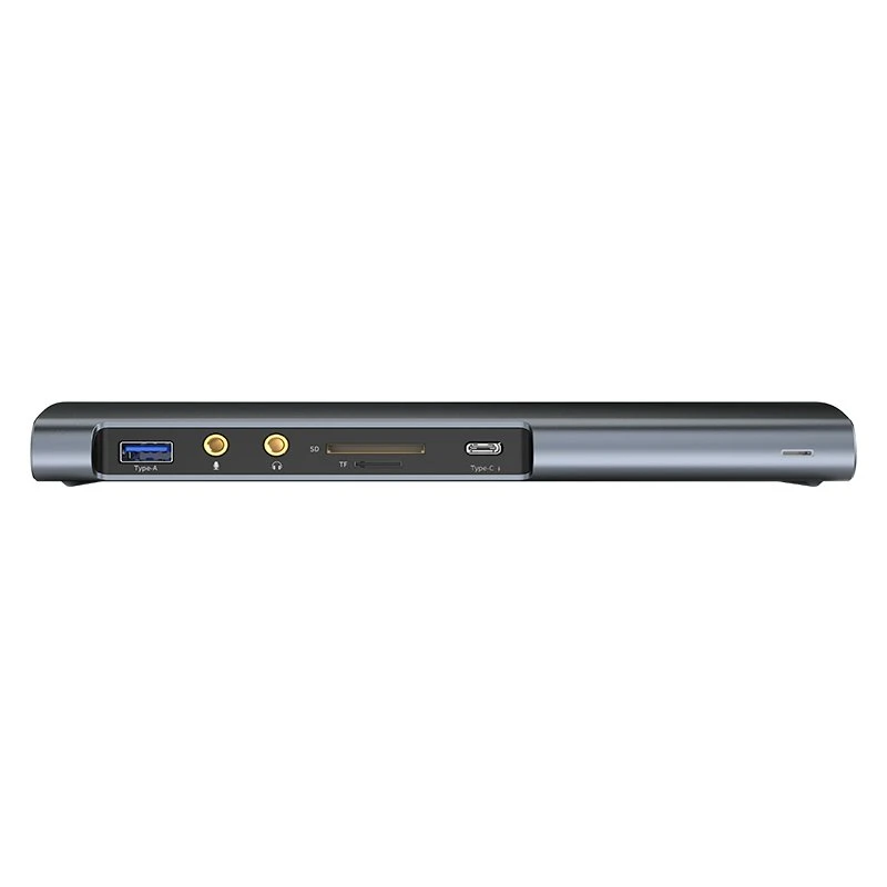 12 ports: USB3.0 Type-A x 3, HDMI x 1, USB3.0 Type-C x 2, TF&SD x 1, VGA x 1, miniDP x 1, RJ45 x 1, Audio x 2. Input is Type-C port. Blue LED indicator light. Made of high quality aluminum alloy. Audiopordid: mikrofon ja kõlarid/kõrvaklapid. USB3.0 support - speed up to 5Gbps. Up to 4K video resolution. ac
