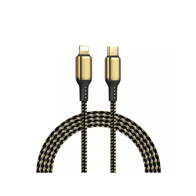 Golden-black 1.2m long Type-C to lightning cable, that has a strong nylon-braided coating. Supports up to 20W fast charge.