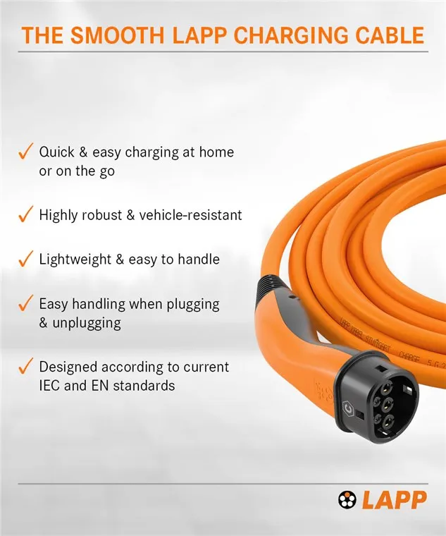LAPP Type 2 standard charging cables connect your EV to the charging station, charging pole or wallbox - for easy charging at home or on the road. Simply connect the coupling of the cable to the car and the plug to the power source. The charging process is automatically started and finished by the on-board electronics. LAPP charging cables are suitable for plug-in hybrid (PHEV) and battery electric vehicles (BEV).