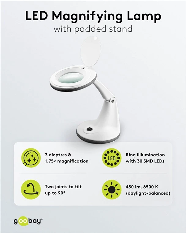 The magnifier lamp with a 100 mm diameter creates a shadow-free, daylight-balanced LED ring illumination.